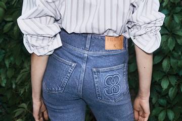 The jeans are also detailed with an archive-inspired two-button closure and the Filippa K 93 monogram embossed on the right rear pocket.