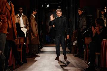 At the heart of the collection was the concept of playing with the conventions “of classic English dressing,” with refined suiting options with two- and three-pieces, as well as topcoats and formal wear seen in fabrics exclusively developed in the heritage mills of Yorkshire, Sussex, Somerset, and Biella, alongside evening suits in velvet and three-piece tuxedos.