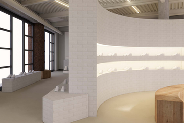 Veja collaborated with London-based interior designer Deidra Hodgson on the concept for the store, which features a rounded shelving display made from 5,000 natural stone bricks made in France.